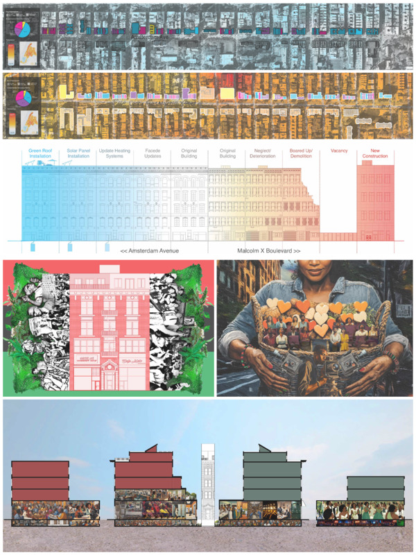 This proposal envisions an expansion of Maysles Documentary Center and Cafe Melo, two vital third spaces along Malcolm X Boulevard, into their adjacent buildings. By preserving their cultural significance and enhancing their infrastructure, the project tackles the intertwined challenges of cultural erasure and environmental inequities. The unsustainable practice of allowing buildings to deteriorate, sit vacant, and then be replaced with resource-intensive new construction exacerbates climate challenges and displaces community spaces. Through preservation and environmental updates, this project benefits Harlem’s community needs while addressing the infrastructure’s climate impact, ensuring these third spaces remain pillars of Black life and leisure.