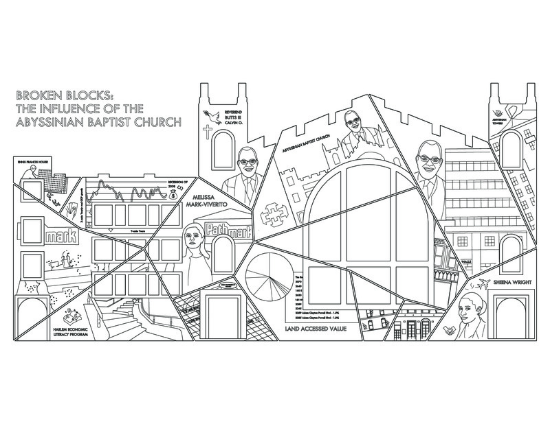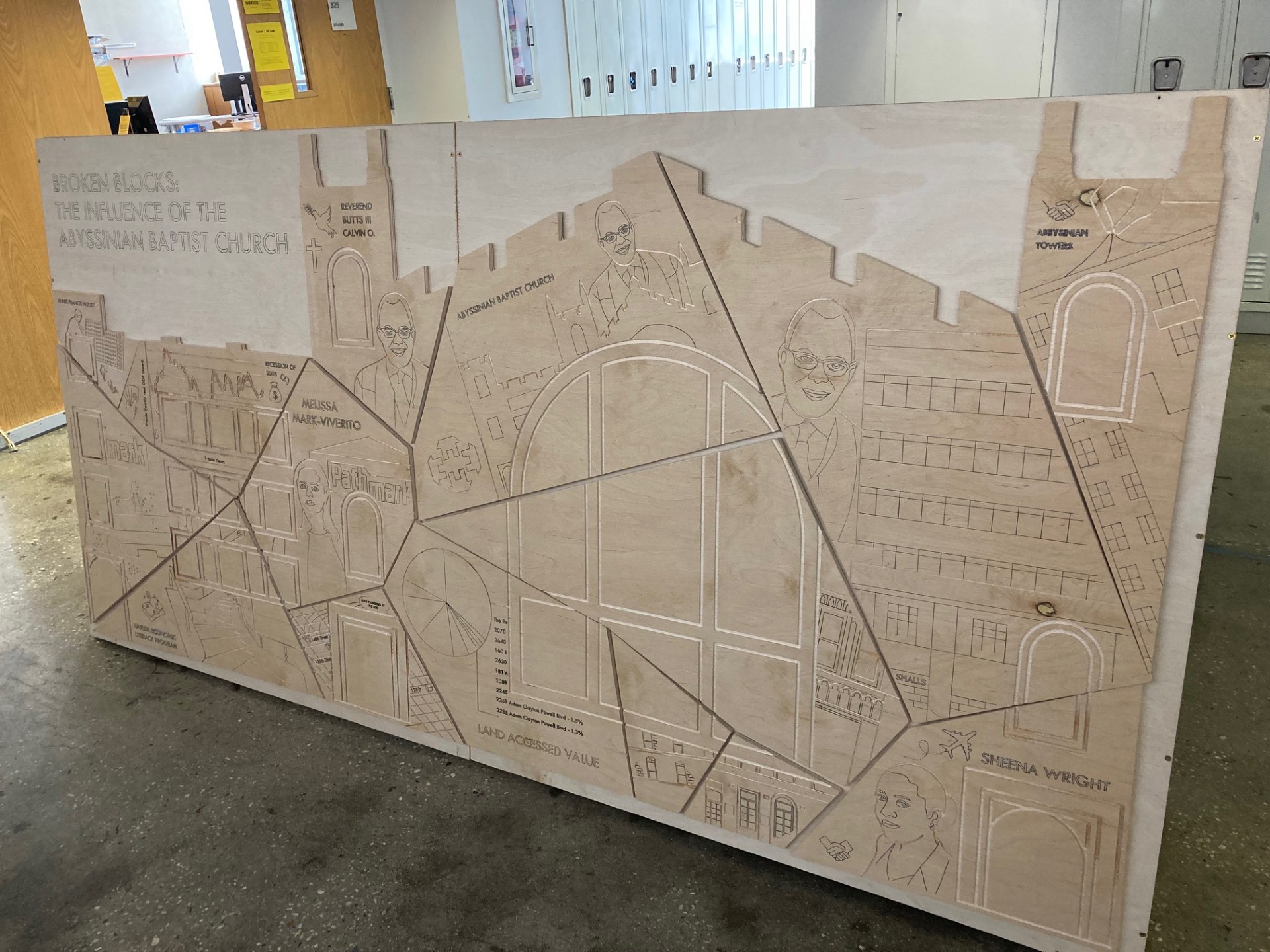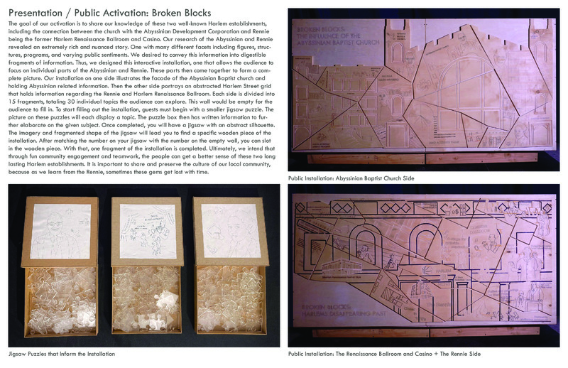 Our research of the Abyssinian and Rennie revealed an extremely rich and nuanced story. One with many different facets including figures, structures, programs, and varying public sentiments. We desired to convey this information into digestible fragments of information. Thus, we designed this interactive installation, one that allows the audience to focus on individual parts of the Abyssinian and Rennie. These parts then come together to form a complete picture. Our installation on one side illustrates the facade of the Abyssinian Baptist church and holding Abyssinian related information. Then the other side portrays an abstracted Harlem Street grid that holds information regarding the Rennie and Harlem Renaissance Ballroom. Each side is divided into 15 fragments, totaling 30 individual topics the audience can explore.