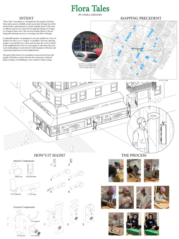 A makeshift speaker was designed to not only amplify the voices of Harlem, but also act as a “fungus” to establish a network, allowing people to record their own voices and also hear the voices of others in the neighborhood. Users are encouraged to talk about their personal relationships (or lack thereof) with the plants of Harlem and/ or personal experiences in the neighborhood.