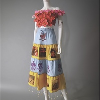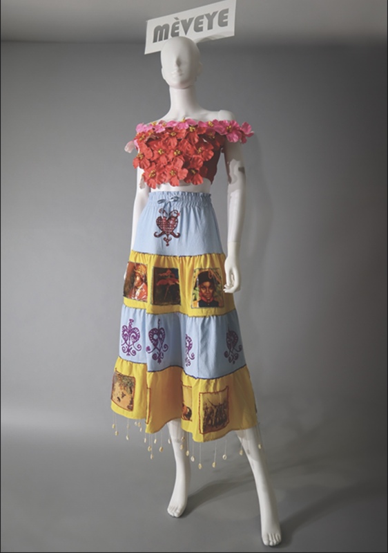This handmade piece celebrates Haitian heritage through intentional color, symbol, and craft, reflecting diasporic connections in Harlem. The red hibiscus conveys boldness, softened by the pink border to suggest care. Blue and yellow skirt layers signify unity, freedom, hope, and renewal, with Vodou vévé signs, beaded frames, and imagery highlighting cultural and historical narratives. Cowrie shells at the hem reference ancestral heritage and protection. Every hand-sewn stitch and choice of materials emphasizes authenticity and the care invested in preserving cultural memory.